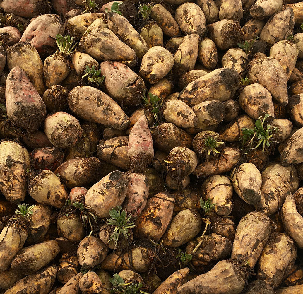 Can produce more dry matter / acre than cereal grains. A sugar rich energy feed for ruminants but the composition can vary. Soil contamination must be avoided to prevent digestive upsets as should excessive feeding; in severe cases this can cause hypocalcaemia and even death. The digestive upsets are due to excessive sugar in the rumen and / or mineral imbalance. Chopping enhances intakes and ruminants relish the root due to its succulence and sugar content.
